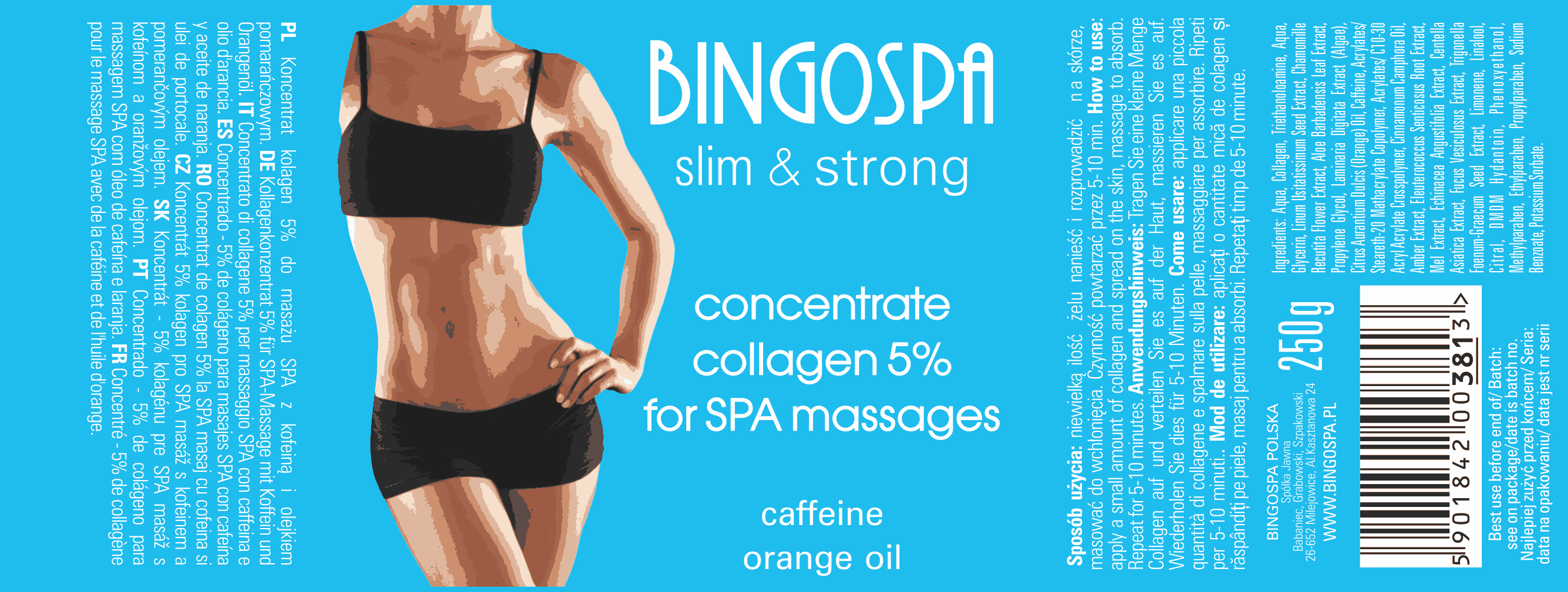BingoSpa 5% Collagen for Massage enriched with caffeine and orange peel oil, renowned for anti – cellulite action and stretch mark reduction.