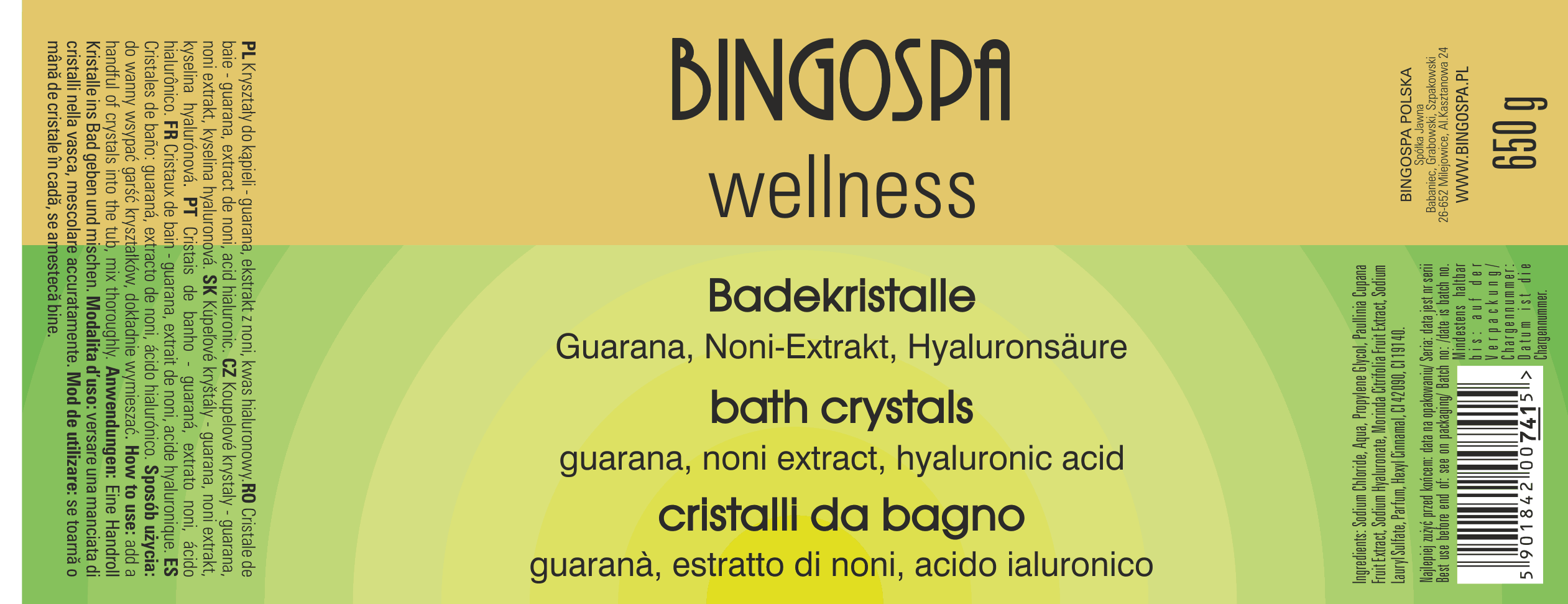 Naturalne kryształy soli BINGOSPA wellness bogate w niezbędne dla skóry minerały i mikroelementy, połączone z guaraną, ekstraktem z owoców Noni (Morinda Citrifolia) i kwasem hialuronowym.