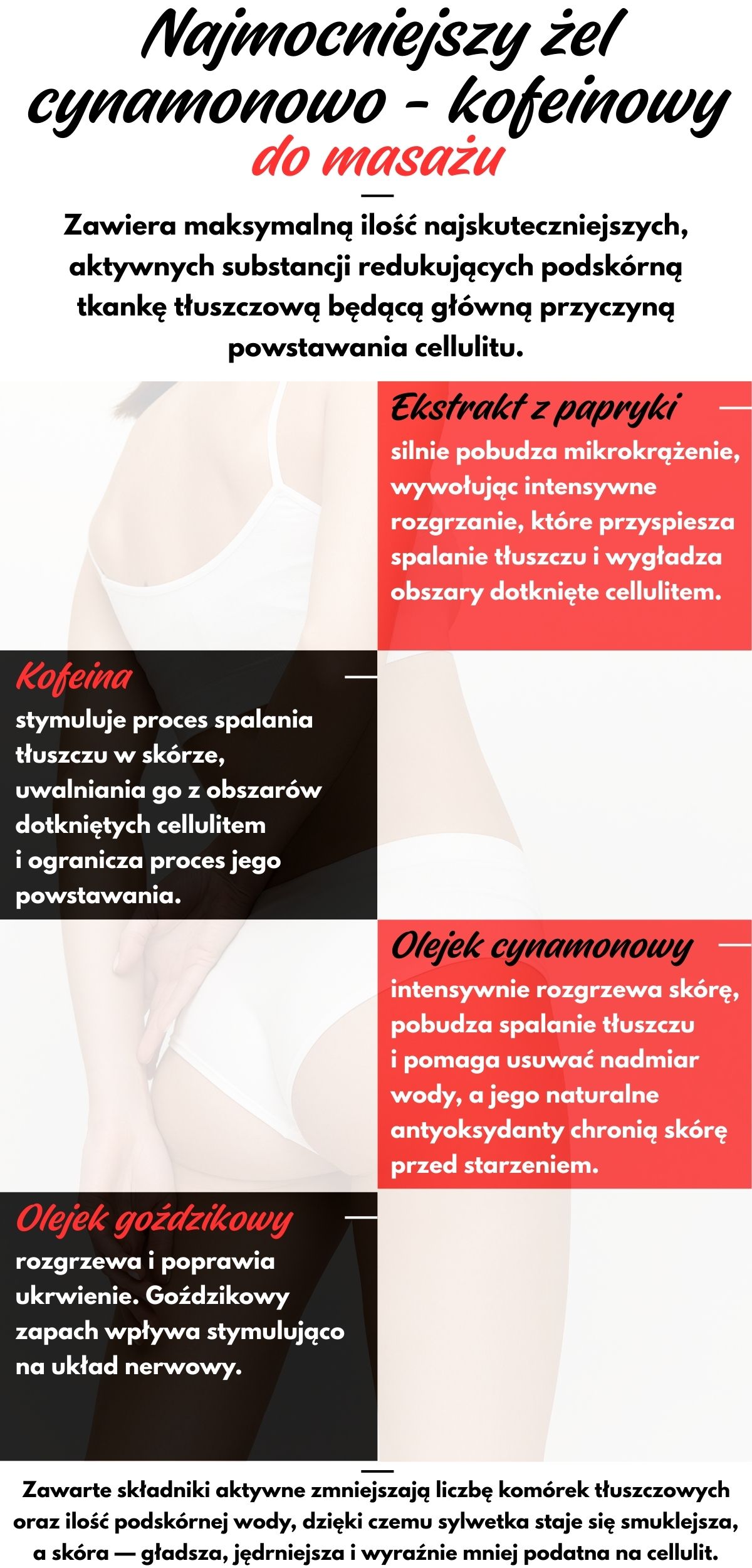 Najmocniejszy żel cynamonowo - kofeinowy z papryką zawiera olejki: cynamonowy, pomarańczowy, goździkowy, kofeinę oraz ekstrakt z papryki. Przeznaczony do masażu.