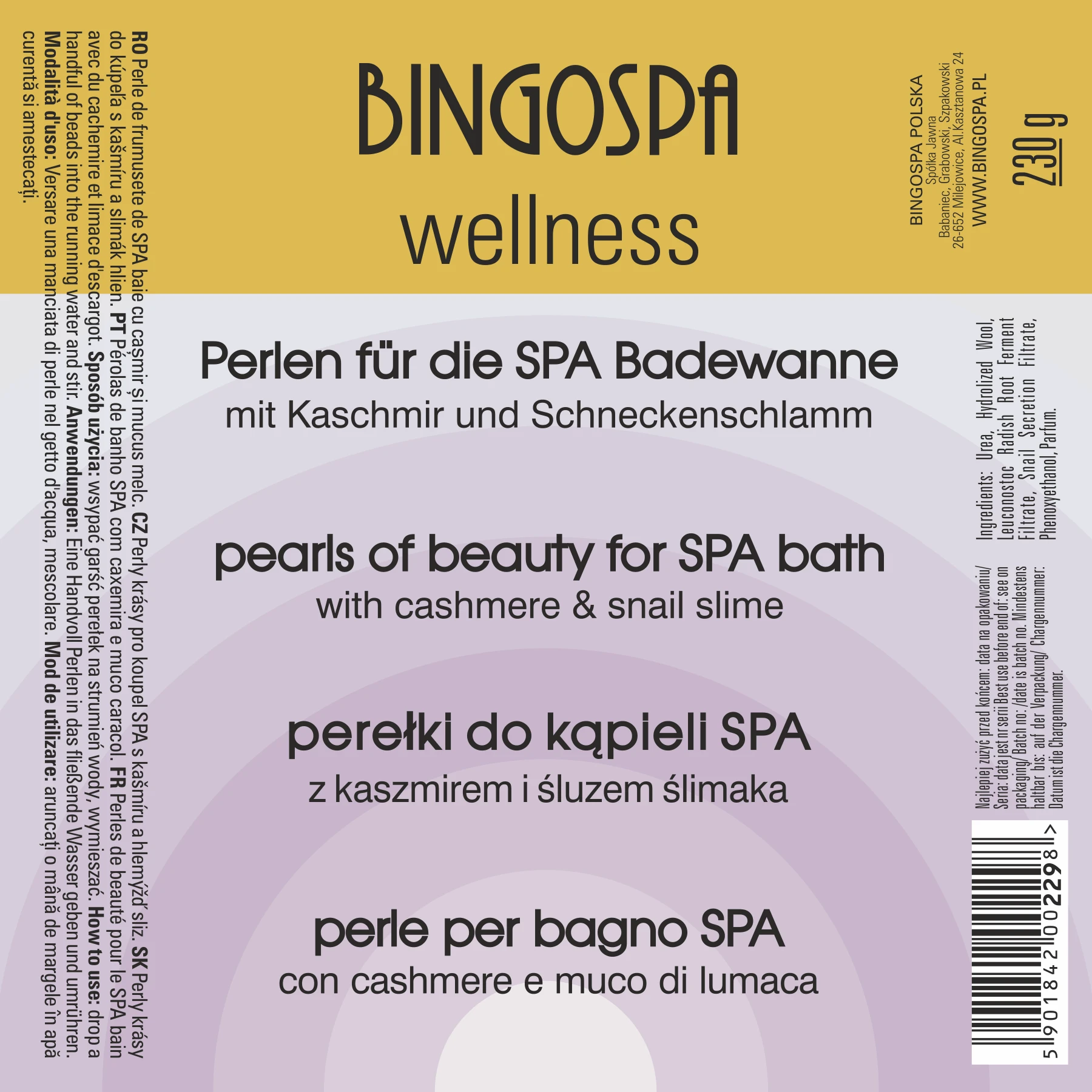 Perełki do kąpieli SPA z kaszmirem i śluzem ślimaka. Zawarte w perełkach proteiny kaszmiru przenikają do komórek naskórka poprawiają poziom nawilżenia i tworzą ochronny film hamujący utratę wody transepidermalnej