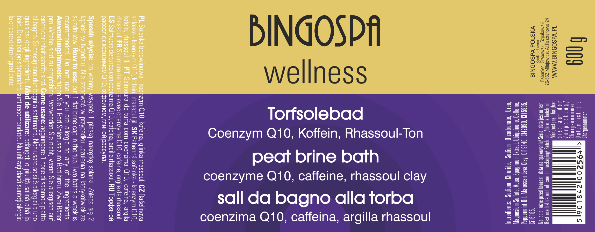W solance BINGOSPA wszechstronne działanie borowiny połączono z koenzymem Q10 - naturalnym przeciwutleniaczem, którego celem jest zapobieganie uszkodzeniom skóry oraz jej starzeniu się powodowanym przez działanie wolnych rodników, kofeiną, która zmniejsza widoczność cellulitu, wygładza i ujędrnia skórę oraz marokańską glinką Ghassoul (rhassoul). Glinka charakteryzuje się wysoką zawartością składników mineralnych, zwłaszcza krzemionki, która ma bardzo ważny wpływ na wygląd skóry, włosów i paznokci. Glinka Ghassoul redukuje suchość i łuszczenie się skóry, zwiększa jej elastyczność i wytrzymałość.