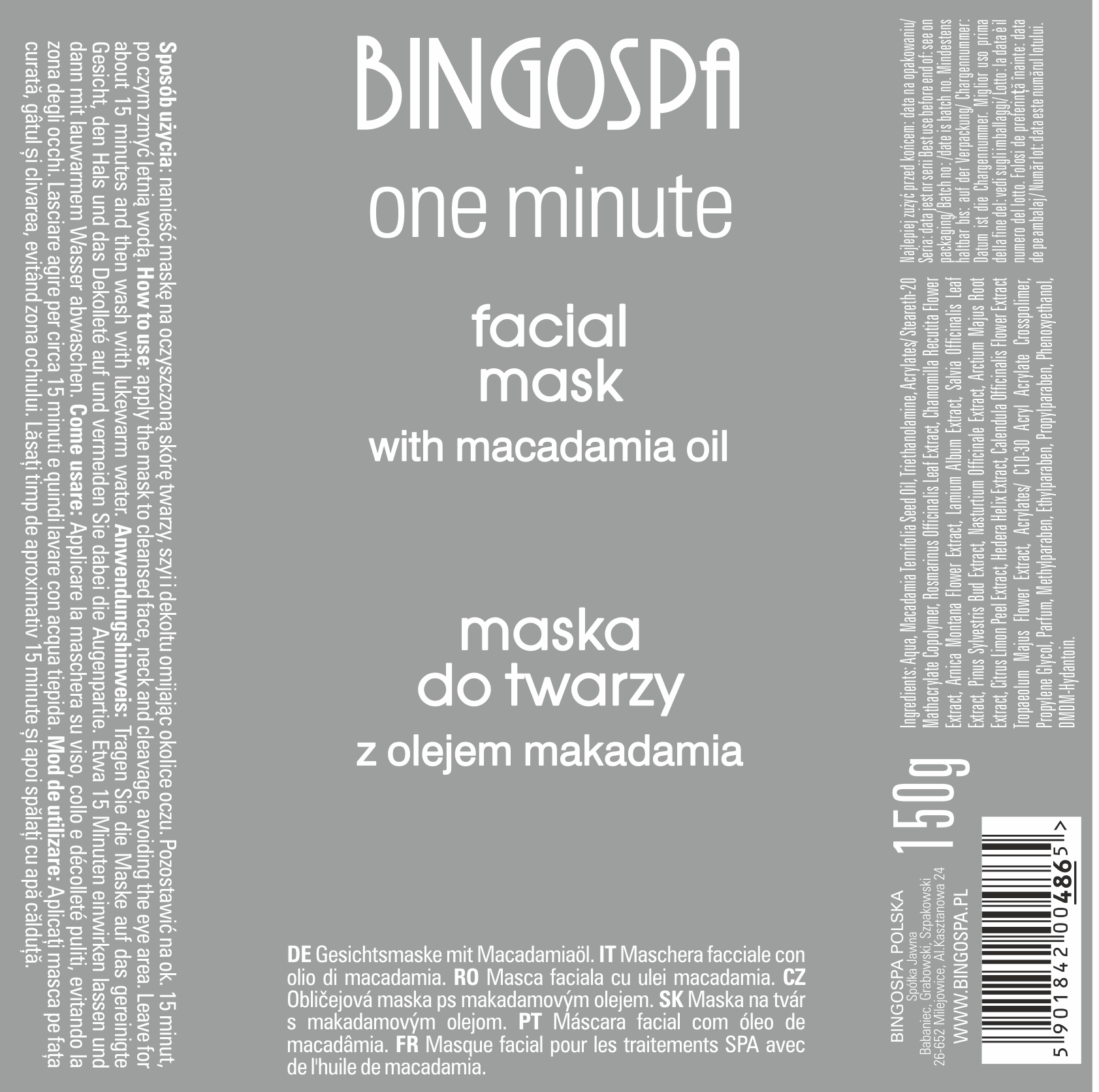 Facial Mask iith 100% Macadamia Oil BINGOSPA one minute